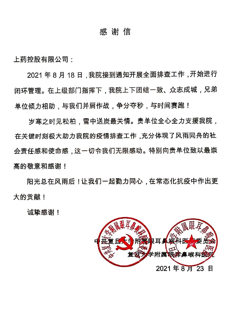 8月19日,眼耳鼻喉科醫(yī)院通過對口服務的銷售代表向上藥控股傳達了用藥的需求。接到通知后,上藥控股快速響應、積極行動,上藥控股全國運營管理中心協(xié)同上藥物流、上海業(yè)務總部等各相關部門及時啟動緊急預案,從開單、配送、與醫(yī)院交接,所有流程加快作業(yè),開辟綠色通道。事后,復旦大學附屬眼耳鼻喉科醫(yī)院寄來了感謝信,對上藥控股在關鍵時刻出色完成藥品保供任務,全力支持醫(yī)院的疫情排查工作表達了敬意和感謝。